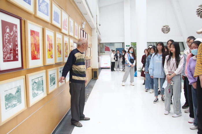 刻纸展包括八个篇章:(1)党啊!亲爱的妈妈;(2)建党百年,历史节点;(3)建党百年,艰难岁月;(4)建党百年,红色景点;(5)建党百年,英雄人物;(6)建党百年,抗美援朝;(7)建党百年,抗日战争;(8)建党百年,抗疫战斗。刻纸民间艺术家殷明欣老师带领大家参观这八个主题共120张刻纸作品,他给大家讲述刻纸作品中展现出的中国共产党艰辛而又辉煌的历程。由重大历史事件到历史人物,由过去到现在,大家深刻感受到当下的幸福生活来之不易,更深刻地感受到在中国共产党的领导下,中国人民生活越来越好。