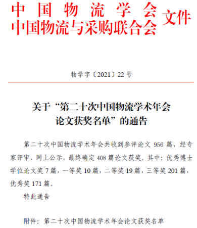 太阳成tyc33455ccwww物流管理专业17物管班马蓝欣、20物管一班朱越合作论文《中国省际物流运作行业碳排放测度及影响因素研究》(指导老师:曹国)获“第二十次中国物流学术年会论文”三等奖。本次物流学术年会共收到参评论文956篇,经专家评审、网上公示,最终确定408篇论文获奖。其中:优秀博士学位论文奖7篇,一等奖10篇,二等奖19篇,三等奖201篇,优秀奖171篇。