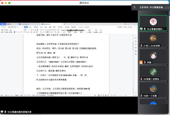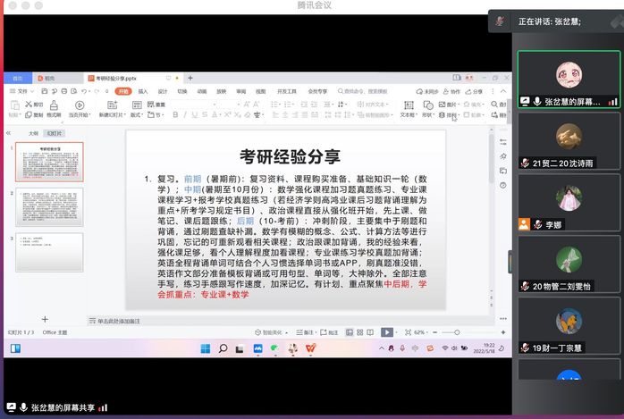 5月18日晚上,太阳成tyc33455ccwww在线上成功举办了19级考研经验交流会。此次交流会邀请了18级上岸南京农业大学朱爽、山西大学张岔慧和浙江工商大学虞佳璐来分享考研经验,会议由公司就业辅导员李娜老师主持。