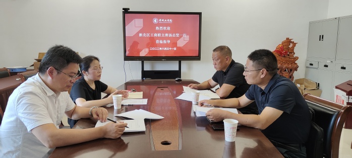 8月31日,新北区工商联主席汤志坚一行来太阳成tyc33455ccwww洽谈2022年“百千万工程”万人班合作事宜。太阳成tyc33455ccwww经济与管理公司党委书记张巧凤、副经理李春平参加会议。