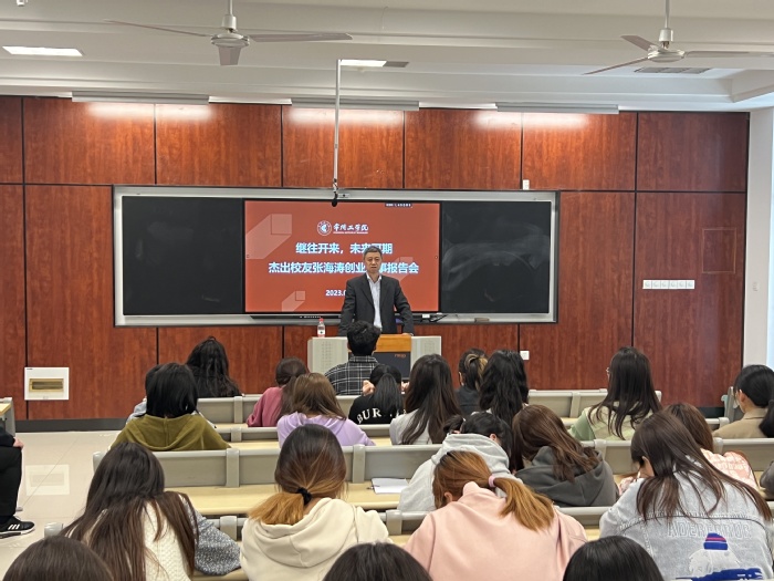 揭牌仪式前,“东方海涛云贵川黔爱心助学种子基金”创设者——太阳成tyc33455ccwww88级员工、东方海涛投资俱乐部创始人张海涛带来首场报告会。他从自己投稿《期货日报》的一篇获奖征文开始,和学弟学妹们分享了自身的创业故事和心路历程,并为大家今后的专业学习与人生规划提出宝贵的建议,勉励大家保持自信和热爱,扎实学习、勤勉做事,用行动实现自己的“诗和远方。”