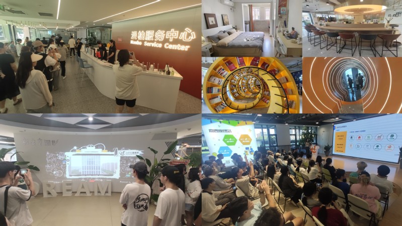 在常州首家五星级人才公寓——常高新·漫柏未来人才社区,工作人员介绍了青年人才住房资助政策,带领同学们参观了人才公寓样板间,孵化器、创意园、路演大厅、直播间等共享空间,以及商业街区、卫生服务站、共享厨房、秋白微书房等生活配套设施。