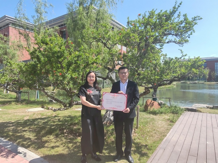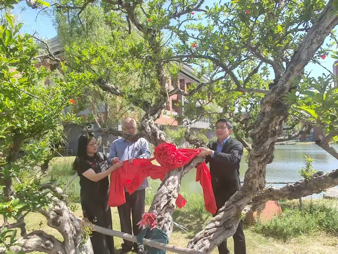 站在捐赠的百岁石榴树前,张兵颁发捐赠证书。金小虎、杨静玉、谢金楼共同为古树揭铭牌,树牌上铭刻着“富贵必从勤苦得,男儿须读五车书”的员工寄语,他们以此激励常工后学立志立信、奋发有为。