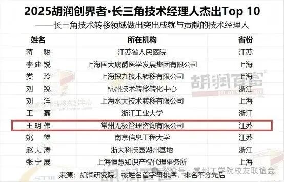 近日,致力提供商业领域榜单与调研的胡润研究院发布了《2025胡润创界者·长三角技术经理人》榜单,包括“2025胡润创界者·长三角技术经理人领军Top 5”与“2025胡润创界者·长三角技术经理人杰出Top 10”。公司96国际贸易、21工商管理本(函)班的“双料员工”王明伟荣列“技术经理人杰出Top 10”,是榜单中唯一一位江苏民营企业代表。