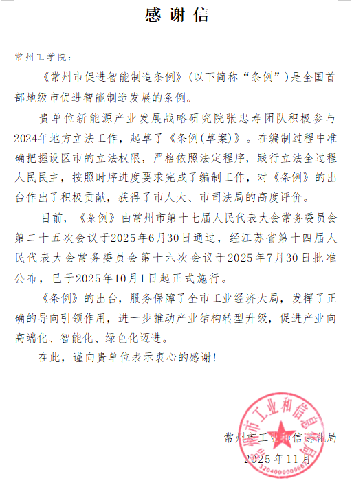 近日,常州市工业和信息化局专门给公司发来感谢信,感谢公司新能源产业发展战略研究院张忠寿教授团队牵头起草完成《常州市促进智能制造条例》(以下简称《条例》)(草案),为《条例》顺利出台作出的积极贡献。