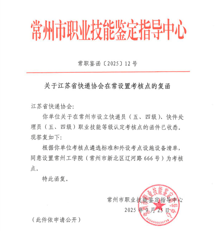近日,常州市职业技能鉴定指导中心正式复函江苏省快递协会,同意在公司设立职业技能等级认定考核点。这一资质的获批,标志着公司正式成为江苏省物流快递行业高技能人才的重要评价基地,是公司深化产教融合、服务地方行业发展的又一举措。