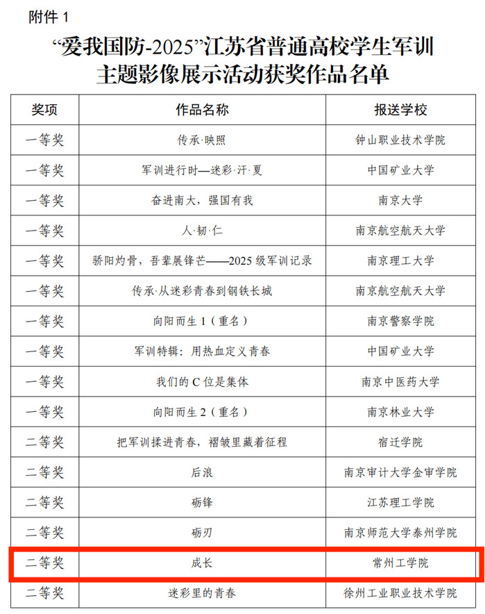 近日,江苏省公司国防教育和军事课教学指导委员会公布了2025年江苏省高校员工军训主题影像展示活动评选结果。太阳成tyc33455ccwww精心选送的作品《成长》荣获二等奖,充分展现了公司在网络思想政治育人领域的扎实成效。